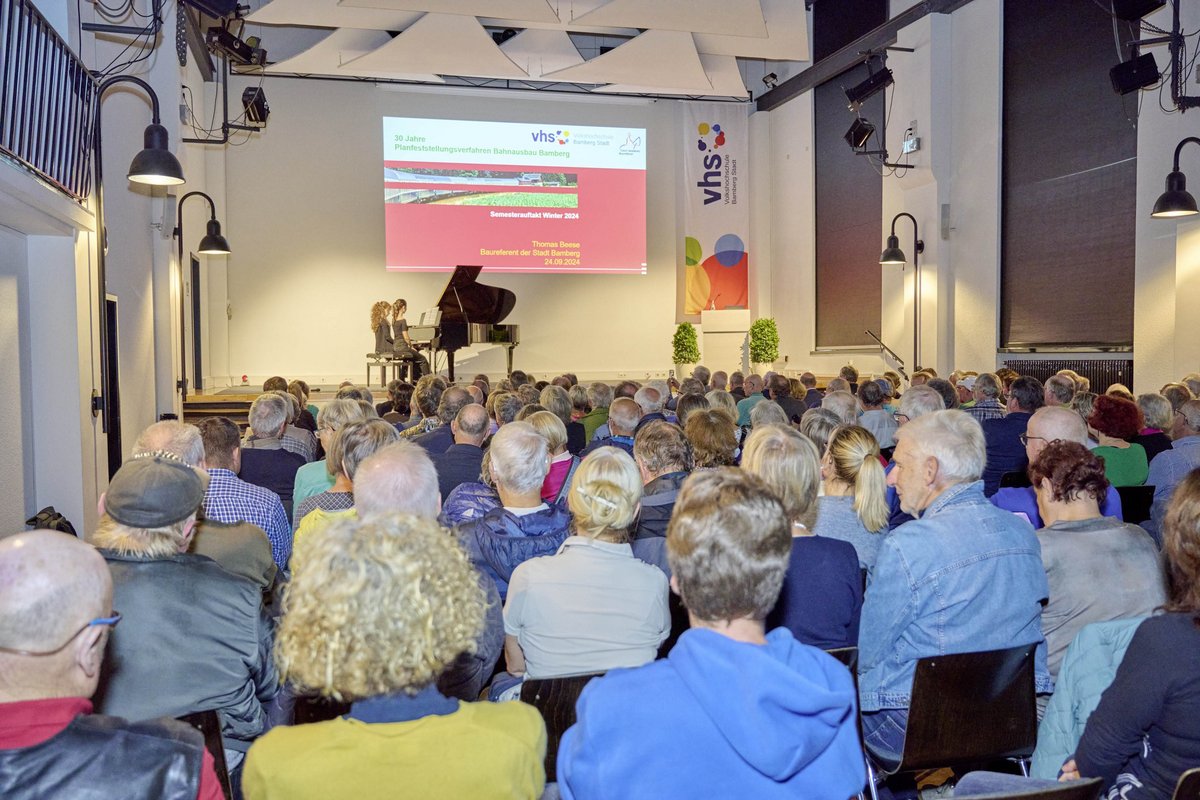 Im vollbesetzten Großen Saal der Volkshochschule Bamberg Stadt haben rund 200 Interessierte den Auftakt ins Jubiläums-Semester „35 Jahre vhs im Alten E-Werk“ gefeiert. Langer Applaus begleitete Prof. Dr. Wolfgang Brassats Vortrag. Wissenschaftlich fundiert und bar jederStimmungsmache analysierte er „Leben und Werk des Landschaftsmalers Fritz Bayerlein“.