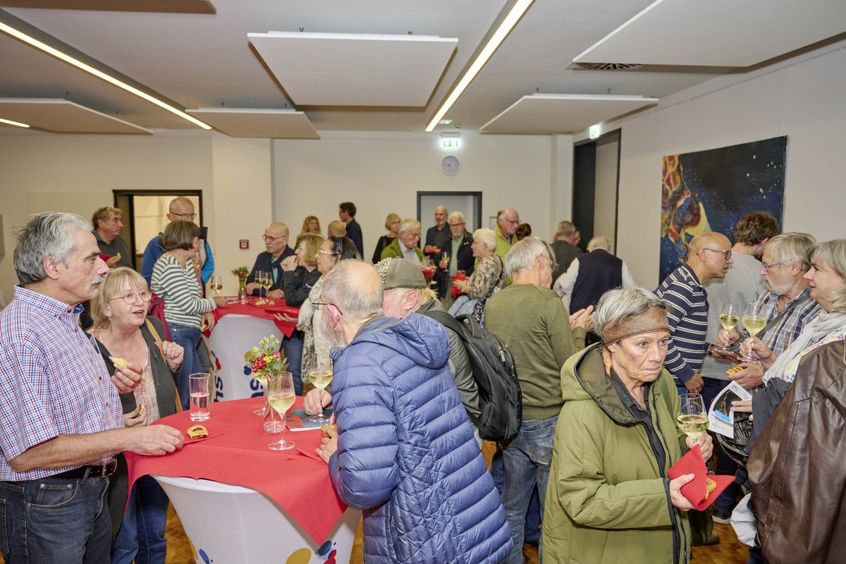 Vor der neuen Terrassenküche gießt Bürgermeister Wolfgang Metzner am Ausschank des Fördervereins ein Glas Sekt ein und reicht eine Flasche Wasser an den nächsten Käufer. „Ich bin aus voller Überzeugung Mitglied im Förderverein, um die tolle Bildungs- und Kulturarbeit der vhs zu unterstützen.“ Andere Mitglieder verkaufen die leckeren Kuchen, Muffins, Party-Snacks, Häppchen und Naschtüten, die weitere Mitglieder beigesteuert haben, um die Gäste an diesem Tag der offenen Tür zu verköstigen. „Die Vielfalt der vhs zeigt sich auch beim Catering“, sagt Vorsitzende Ulrike Siebenhaar augenzwinkernd und gibt mit einem Lächeln Wechselgeld heraus. Als Kulturreferentin ziehe sie ihren Hut vor der Leistung des 13-köpfigen vhs-Teams: „Chapeau, was die Kolleginnen und Kollegen parallel zur Semesterplanung auf die Beine gestellt haben.“