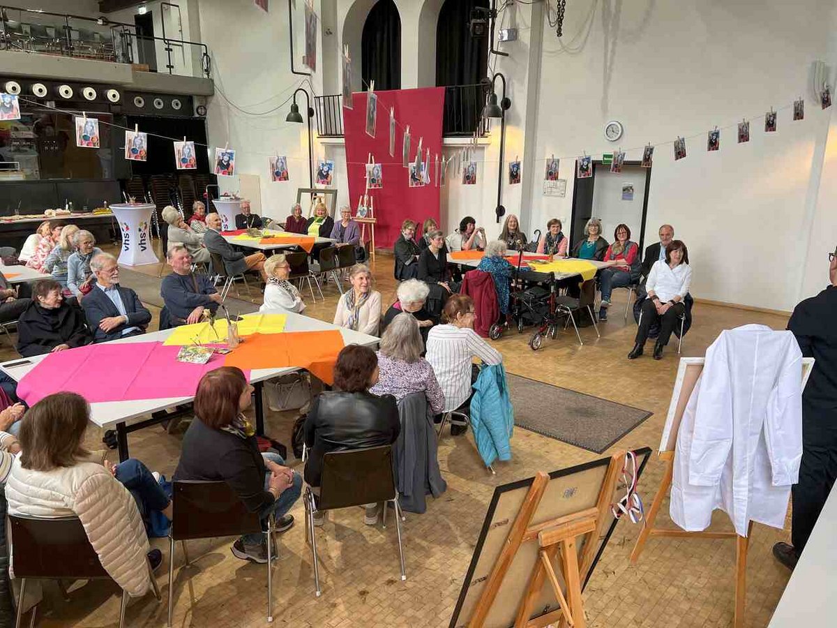 Die Volkshochschule Bamberg Stadt hat Gabriele Günther mit einem kreativen Fest in den Ruhestand verabschiedet. Die akademische Malerin und langjährige Dozentin prägte das künstlerische Kursprogramm über fünf Jahrzehnte. Rund 60 Gäste würdigten ihre außergewöhnliche Lehrtätigkeit – viele davon ehemalige Kursteilnehmende. In einen neuen Malkittel gehüllt –bunt von allen signiert – nahm Günther die Anerkennung sichtlich bewegt entgegen. Der Große Saal des Alten E-Werks wurde für die Verabschiedung in ein farbenfrohes Atelier verwandelt.